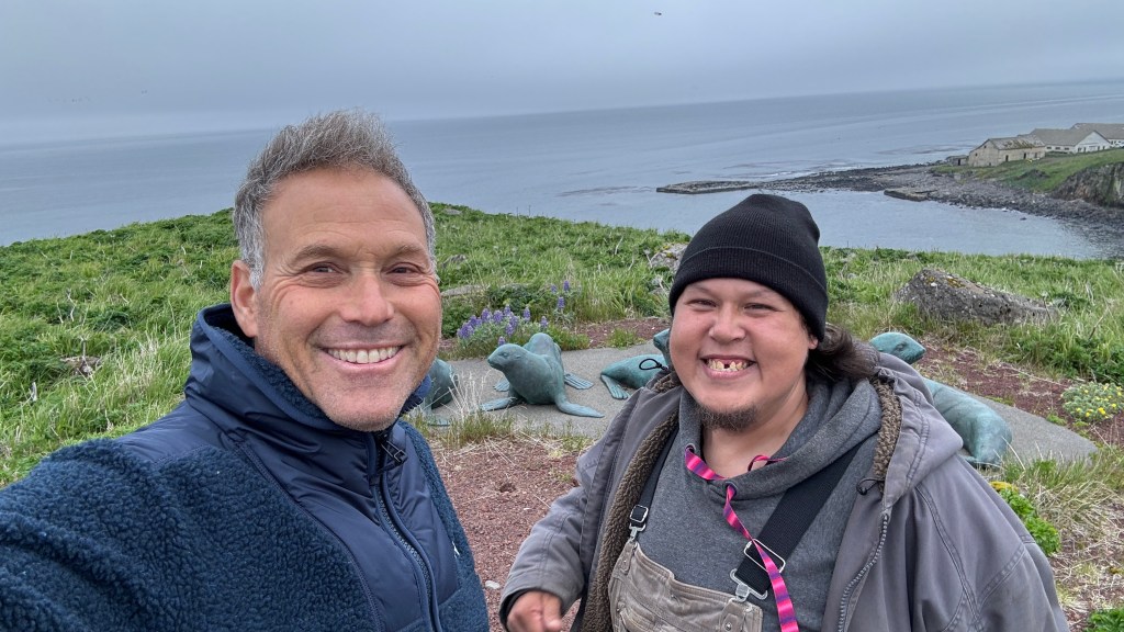 Above, Curtis and I take a selfie in front of the Fur Seal Monument that overlooks the Sealing Plant.