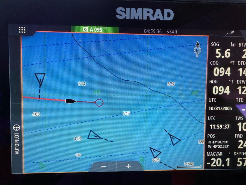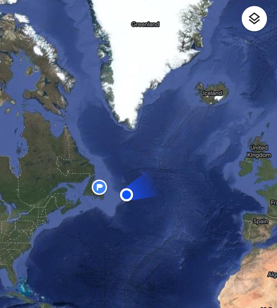 Good morning! As you can see from the pic above, we are about 300 miles offshore from Newfoundland. The light blue area is the Grand Banks which we are just now exiting.