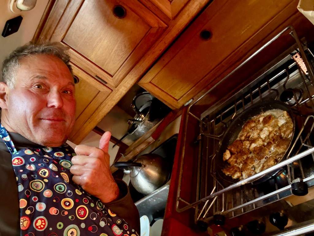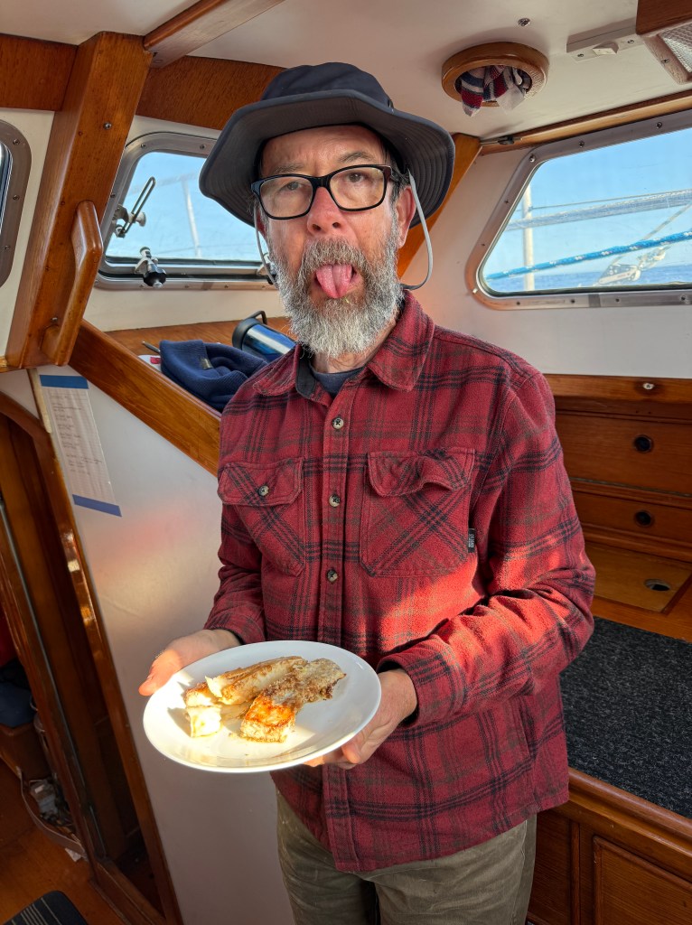 Here is a quickie shot of me frying up the Cod Cheeks. Cooking fish in an enclosed boat is sub-optimal. The result might be delicious, but the lingering smell of fish and cleaning up the splatter are no fun.