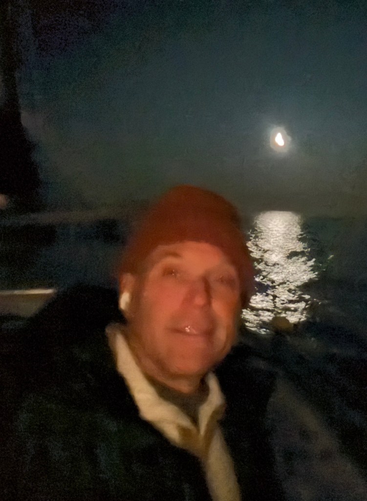 What I did not report was how cold it was. It hit 40 degrees Fahrenheit the night we left. We were thinking that we would soon hit the tropical southern air, but I guess that because we are heading due east at this point and still looking for icebergs warmer weather will follow. Event though we are heading for the equator, I still kept my down jacket and down sleeping bag and I am glad I did as I needed them. The two pics above are at around midnight when the moon decided to rise just ever-so-slightly out of the SE sky.