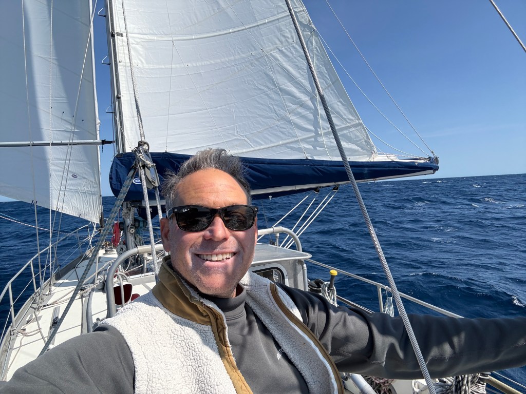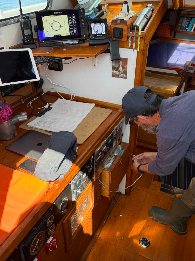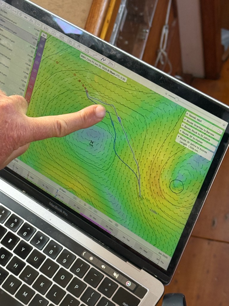 Above is Randall giving me a lesson in weather and routing which go together. We will try to stay out of the high pressure systems which are the round blue areas. High pressure = no wind. The two lines you see are alternate routes, the lower one might entail motoring as it gets closer to the “high”.