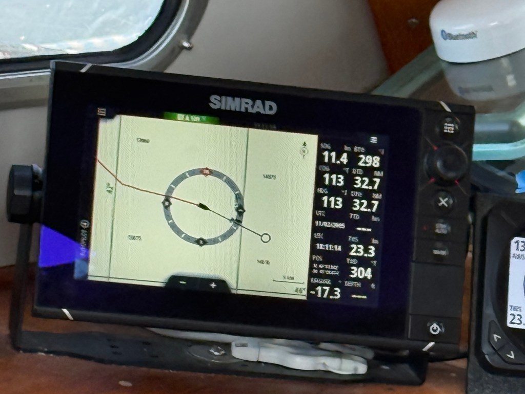 A byproduct of the warmth and weather is having the wind pick up – this makes the boat reach incredible speeds for just a moment. On a normal day, we are lucky to average six knots. But before we could trim the sails back, we were hitting 12 knots while “surfing” down a wave. Pretty good for a boat that has a hull speed of about seven knots. In the picture above, I was able to catch the speed at 11.4 knots in the upper left column.