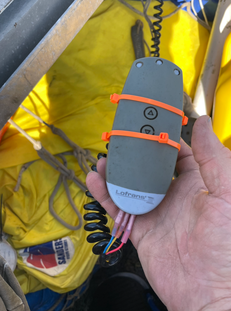 It’s just a three-wire switch, so quickly cutting the wire and stripping back the sheathing let us “jump” the windlass to operational. Once anchored, I went at something more permanent.