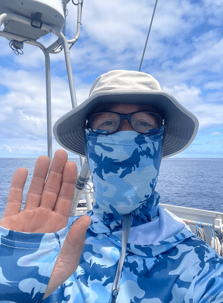 Overnight phosphorescence has become intense. There’s the torpedo-like trail aft of the prop, dull bluey-white and too faint to be photographed; around this flash some unknown-to-me sea creatures bright as exploding stars. On another order of brightness is the splash of the bow wave that has the bluey hew of a flash bulb. All are in that same ghostly shade of the Arctic’s Northern Lights. I tried for a good picture, but nothing more than splotches so far…
