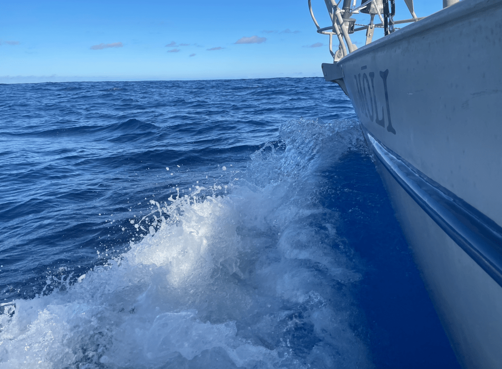 Add to this a peculiarly large swell coming from the east into which we drop and slosh. There is no easterly wind anywhere east of us, none at all. So whence cometh this old, four-foot sea at seven second crests?