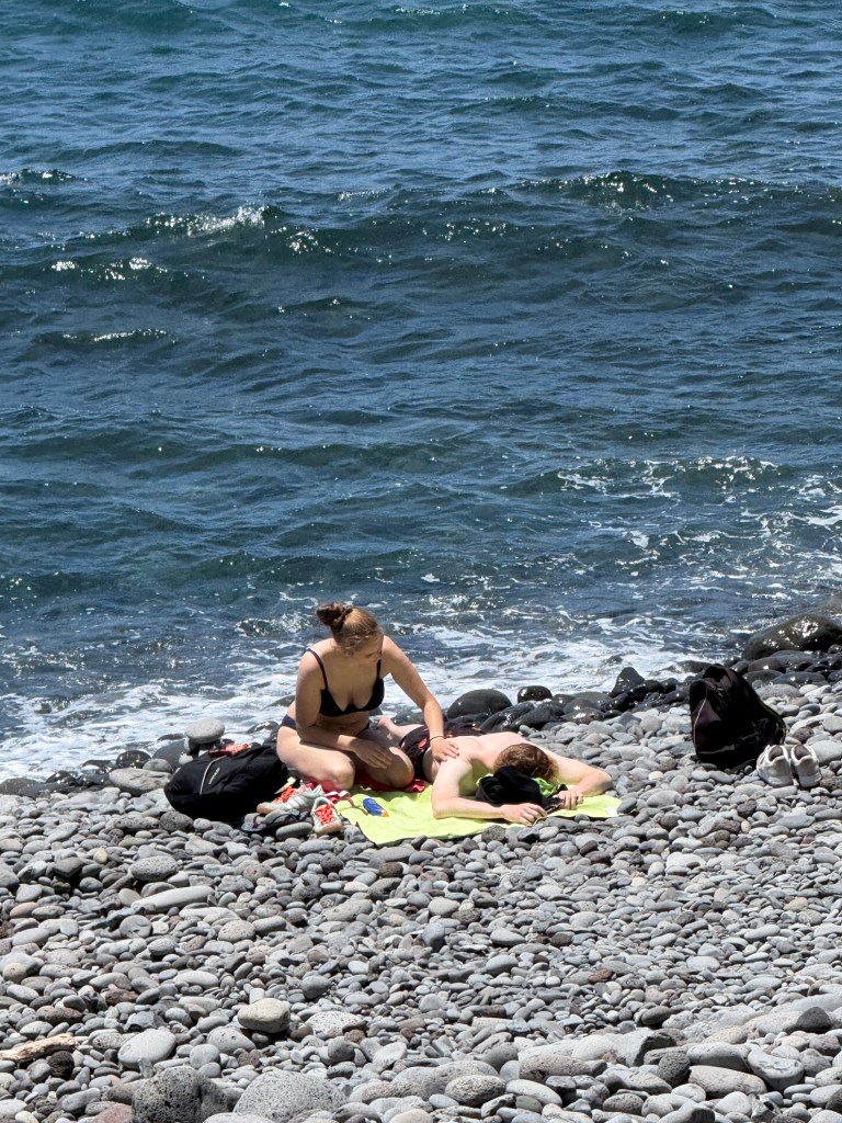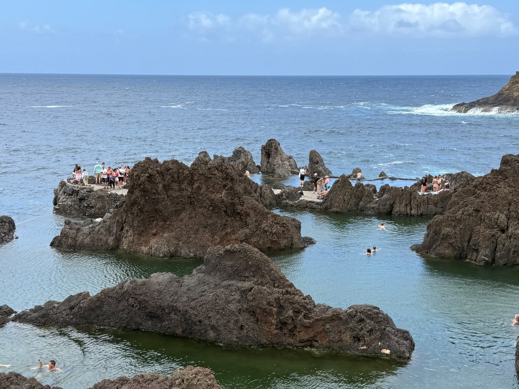 There are some benefits of a rocky coastline sans sand. Madeira has three sets of seawater “pools” that are adjacent to the ocean, but provide protection, beauty and a central spot that islanders can gather and swim. Above is Porta Moniz Natural Pools. Even on a relatively cool day, people are socializing and swimming.
