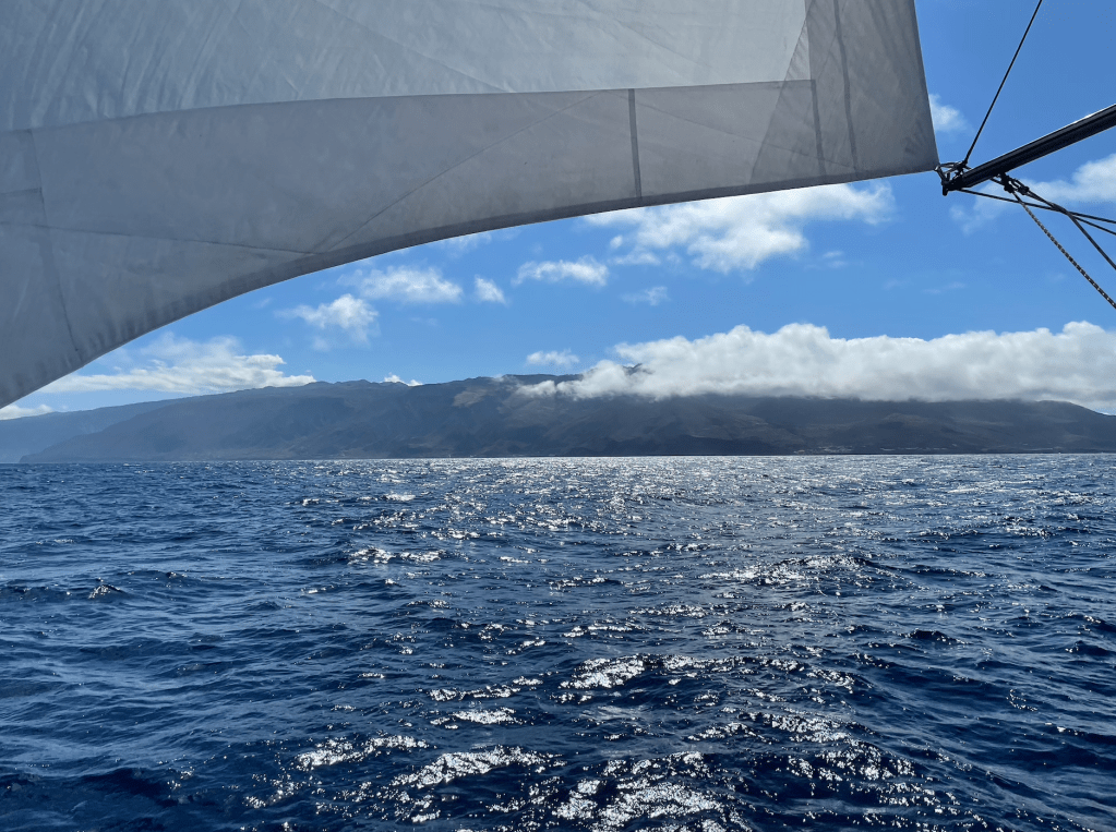 I had decided on a path between the Canary Islands because there we could pick up some wind in the vortex created by the land masses. Engine off at noon and Mo was wing and wing with a big genoa billowing out from either bow. By evening the last of the Canaries, Hierro, was well astern, and Mo plowed steadily on…