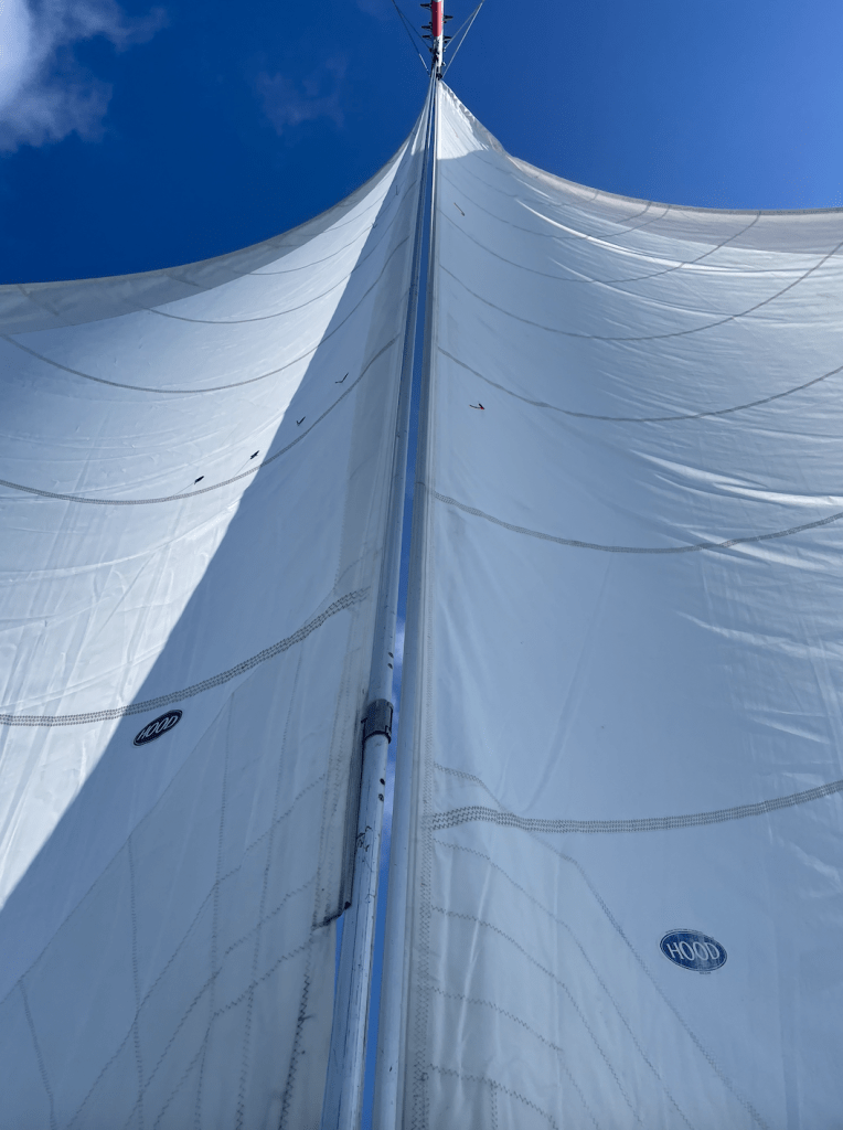 Sailing lasted until midnight. The moon is just past full now, but under heavy cloud the blackness of night was total. Harmon and I in a world lit by headlamps slowly took in the big sails and with heavy hearts switched the engine on again.