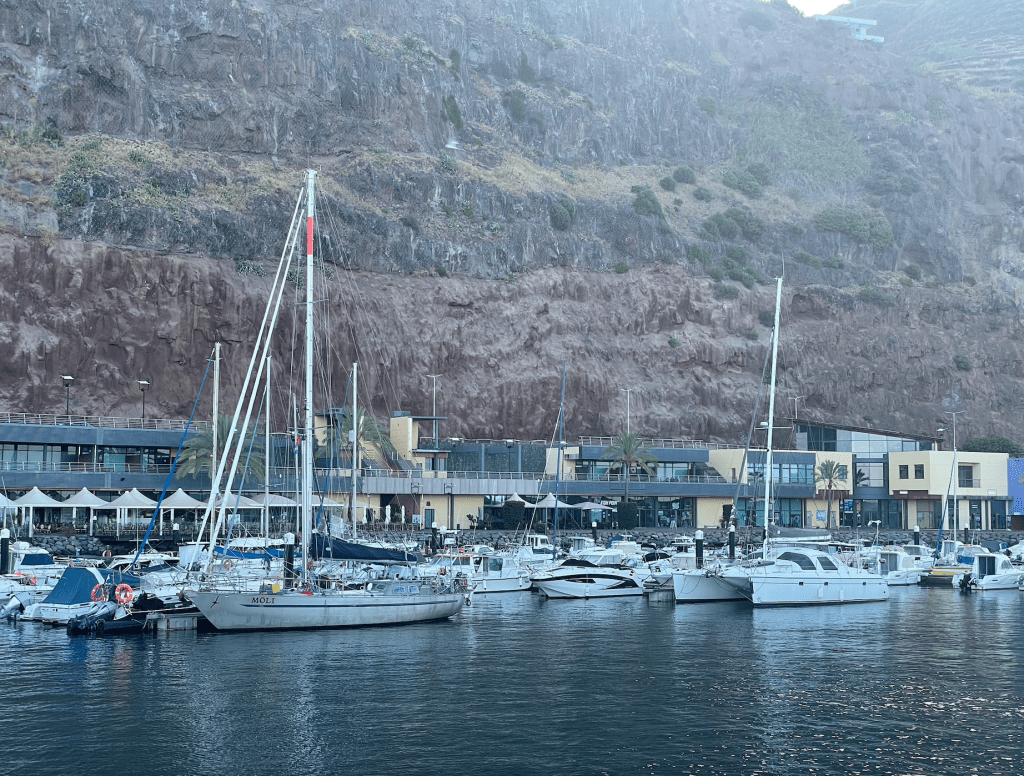 In Madeira, we hadn’t been allowed to berth at the Funchal Marina just below the island’s major town. The marina is small and others had beat us to the punch. Instead upon arrival we were directed to an anchorage area just beyond the breakwater where ten other boats of similar misfortune heaved and gyrated on the admittedly minimal Atlantic swell. I balked at leaving Mo for more than a few hours in an open roadstead, though others did routinely, and so after a day, moved her for the duration to the village of Calheta, two hours westward and a berth behind a concrete wall.