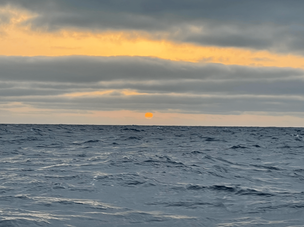 Harmon thinks that I futz with Monte’s strings too much, always in search of the perfect heading and never satisfied for long. So, he was shocked to learn this morning that once deployed, I touched not a hair on the windvane all last afternoon and all night as we tobogganed the growing sea.