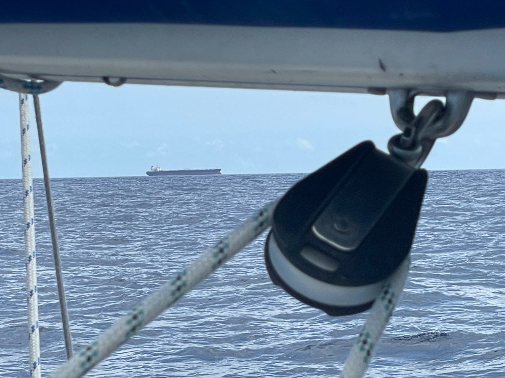 Another oddity. A couple nights ago we passed a ship adrift, Copper Spirit, a tanker, empty and floating so high as to seem out of the water. It took hours to approach and pass, and in that time the ship moved south at about one knot. It’s position was some two hundred miles off the coast and four hundred north of Cape Verde. On its AIS page at the line “Destination:” read “WAITING FOR ORDERS.”