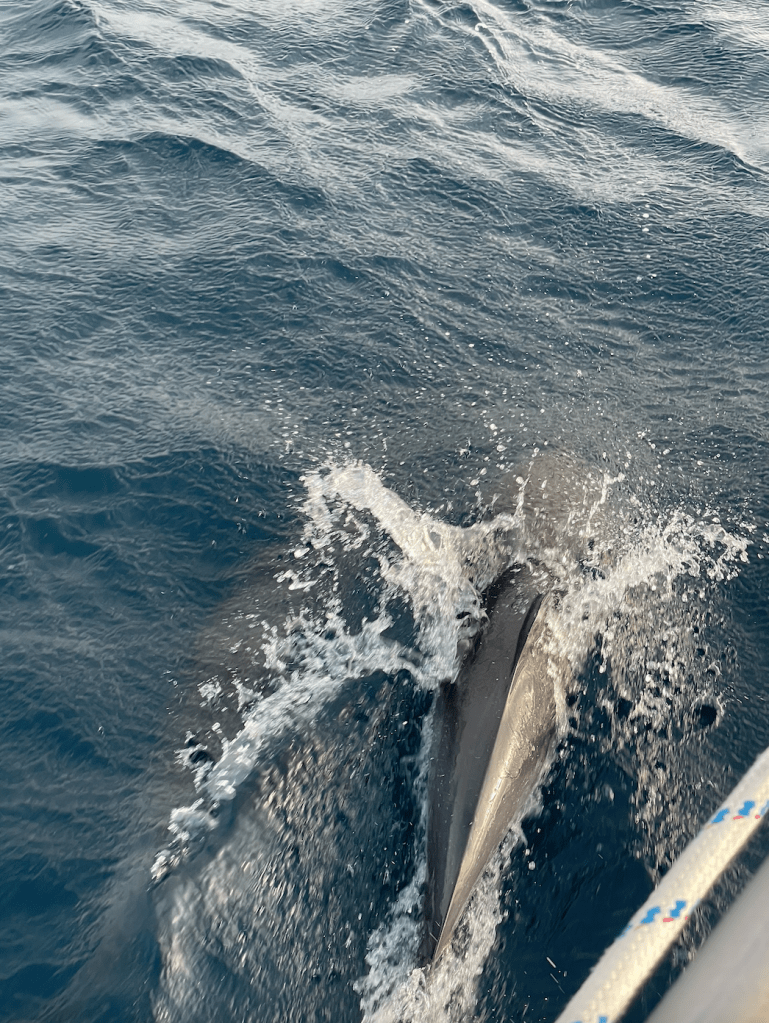 If I didn’t know it, I might suspect there are islands nearby, in this case Cape Verde 157 miles to the south. Bird sightings have begun to increase—a few storm petrels, for example, even a few together. And late, a large herd of dolphin lolloped by for a play in Mo’s bow.