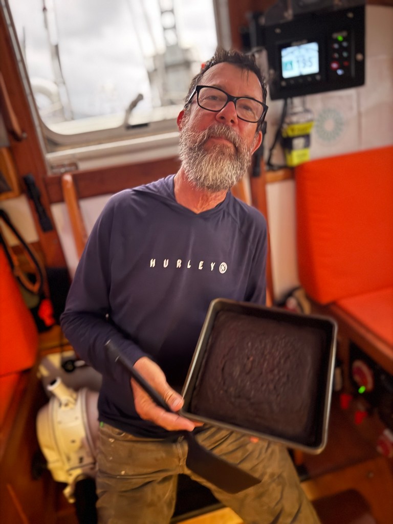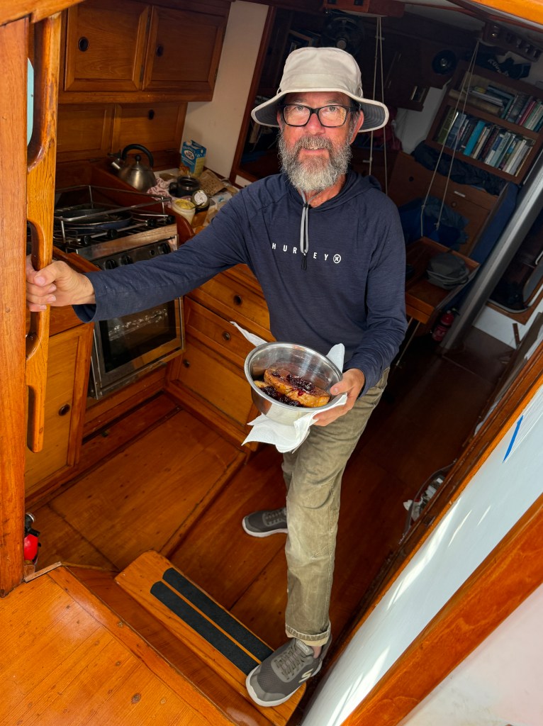 Above: Birthday Boy gets French Toast for breakfast (made from last nights Challa). There is a backstory here. For those who recall last year as we were sailing the Northwest Passage, I clumsily forgot Randall’s birthday. Randall, of course, downplayed the incident by saying he is offshore most birthdays (that means alone), so he is not in the habit of birthday celebrations. Anyway, my bad, and I swore not to let it happen the next time.