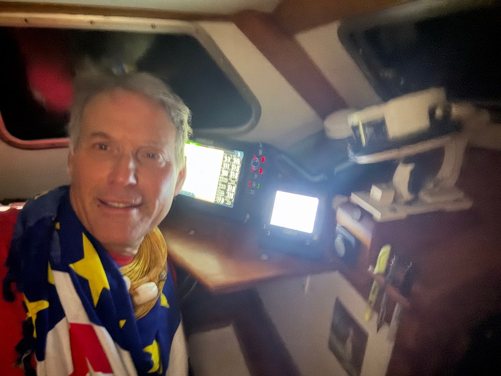 Above: It is now just past 1900 and we can see the GPS monitor behind me (our modern day sextant) clicking down the minutes. In anticipation of the crossing, I am dressed in my best Pollywog outfit suitable for sailors who have never crossed the equator and who are ready to pay homage to Neptune’s court. Randall, of course, has been admitted to the Ancient Order of the Deep long ago, so no such obligation on his part.