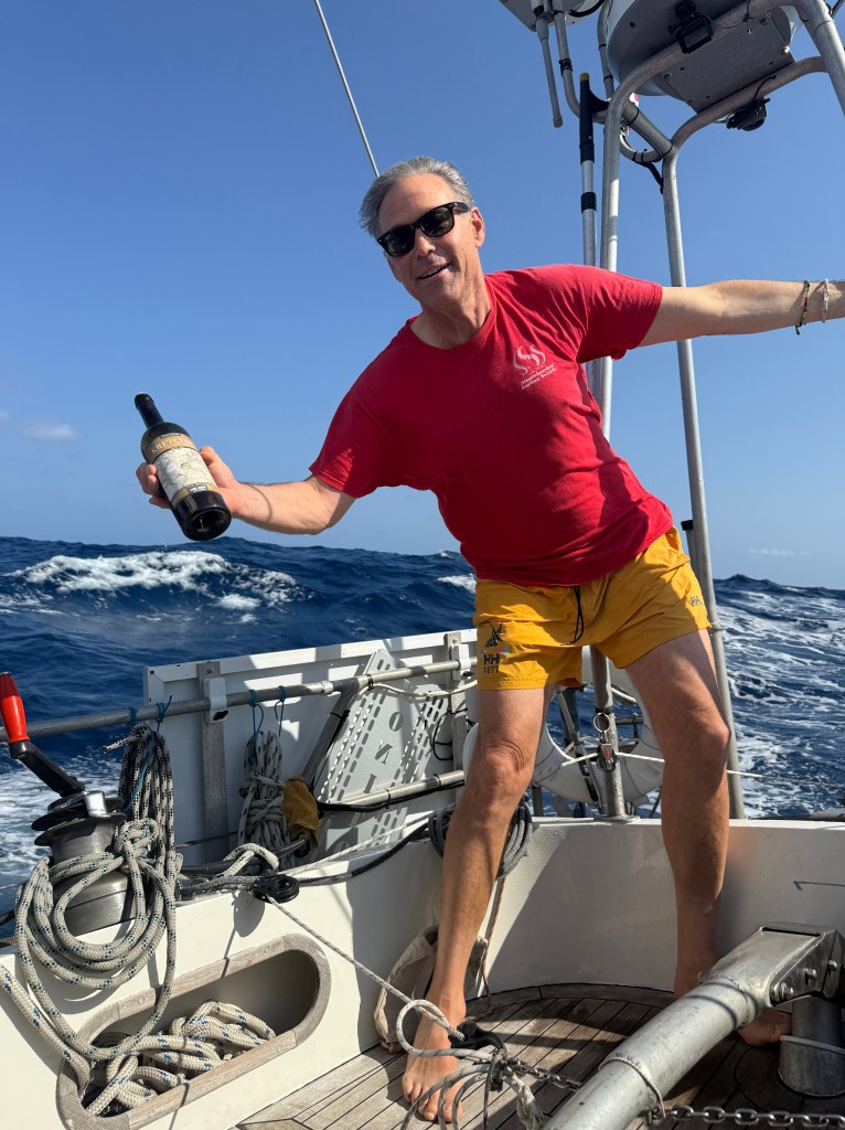 Above: In the presentation of my gift to Randall, I let it be known that as long as the M.O.B. wine is not opened while we are on board, Neptune promises that no man shall go over.