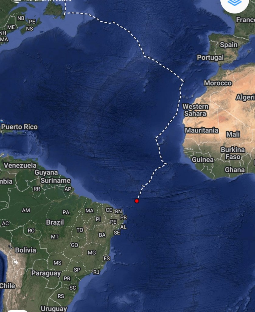 Well, here we are at the end of a long day. The Northern hemisphere is now behind us and we are in a new ocean. Please let me introduce you to the South Atlantic…..