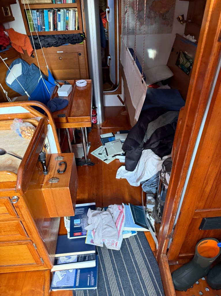 Above: To avoid contact with a (not so) friendly oil rig, we found ourselves coming about to change direction in 18 to 20 knot winds. This caused some intense rocking and rolling which signaled to our bookshelves to empty themselves. We did not clean up until daylight.