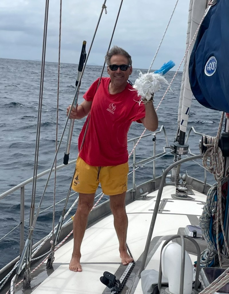 Above: Like we needed more drama??!! I was resting and Randall was on watch as we were approaching Rio de Janeiro (40 miles out?) We both heard the unmistakable sound of something fouling the prop or otherwise causing friction to the shaft. The prop still worked, but torque was significantly reduced. We could see nothing trailing the boat – there were no obvious signs. So Randall engaged the shaft in forward and reverse maybe 10 times and out came the above plastic mass. Order restored, and we continued making our way in.