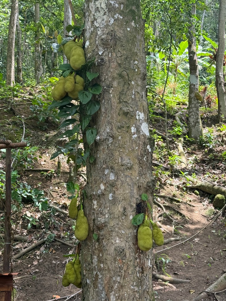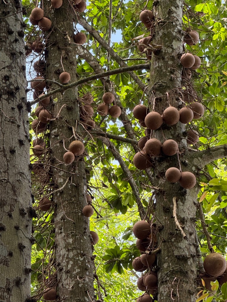 What I love about the tropical jungle are the wild fruit trees. Above left is the Monkey-Apricot Tree – also called the Cannon Ball Tree (for obvious reasons!). As you may recall, these trees grow in Rio, but humans cannot eat the fruit. They have anti-fungal properties. Above right is a Jackfruit Tree which is a species in the fig, mulberry and breadfruit family.