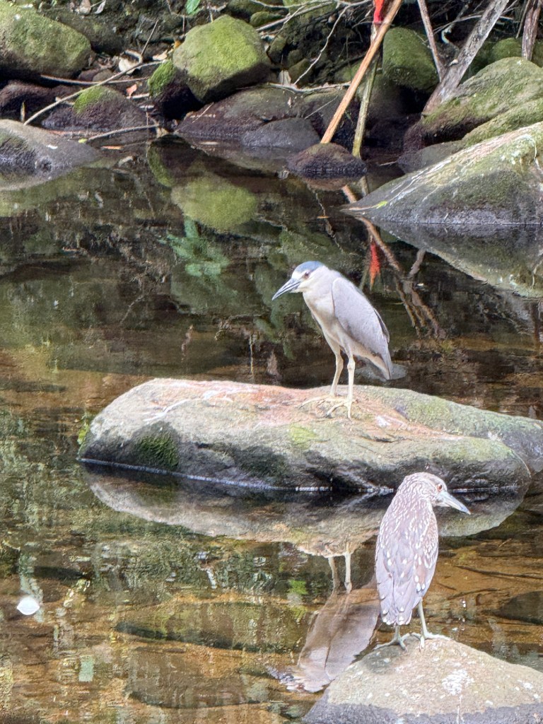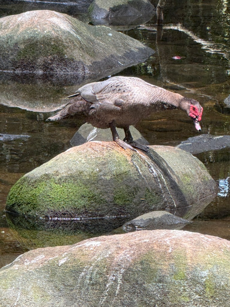 Above left is a Muscovy Duck known for their distinctive red fleshy growths (caruncles) around their beaks and faces.They are generally calmer than common ducks and have a strong brooding instinct. Above right is a Black-crowned Night Heron. They possess red eyes and a strong, pointed black beak.