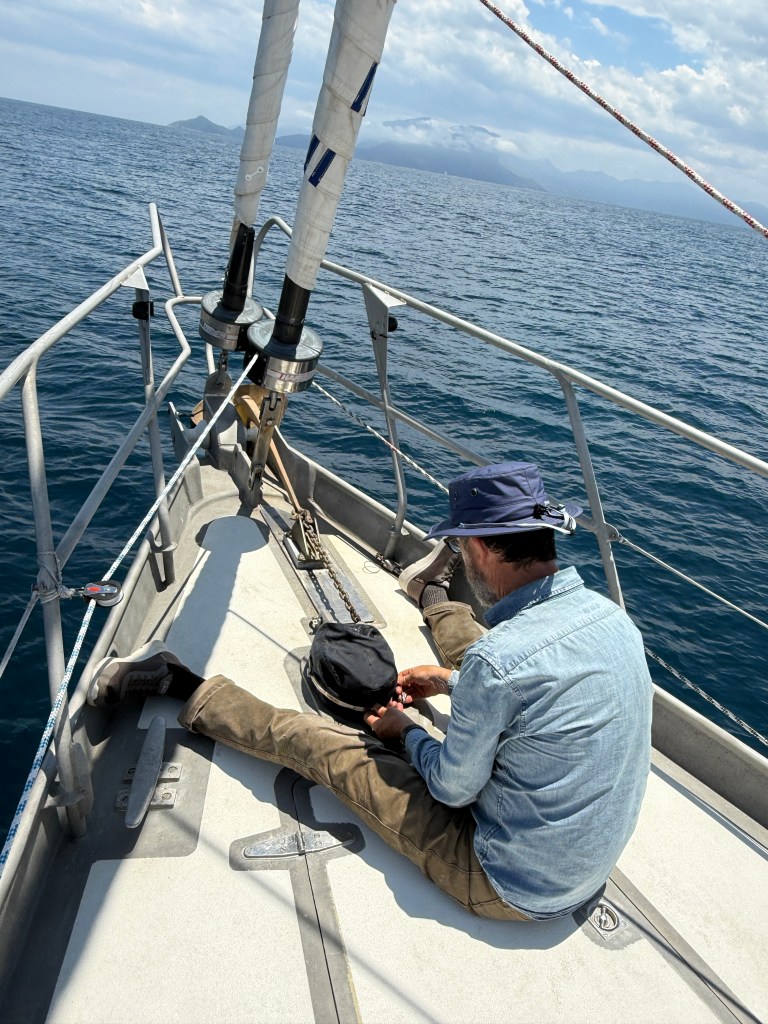 Above: Before taking a hike onto the island, Randall took some time catch up on Mōli maintenance issues. Randall had replaced the standing rigging back in Newfoundland, but some of them had loosened up during our last leg, so they needed tightening. Especially the backstays.
