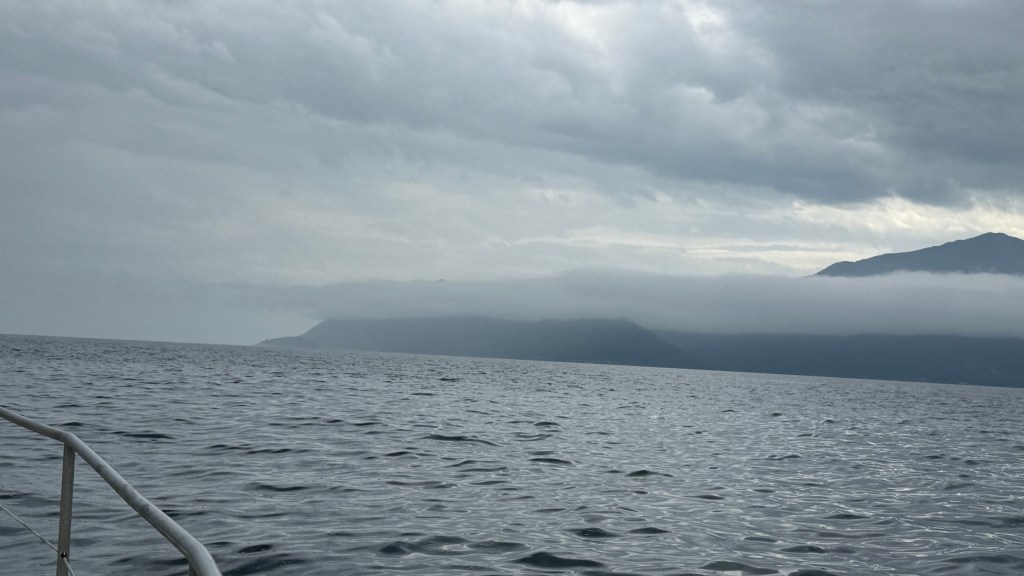 Above: We have left the island and are on our way. We’re seeing fog for the first time. This makes us homesick for San Francisco Bay.
