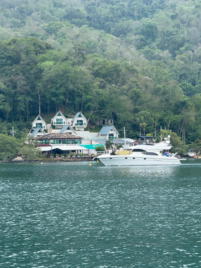 Carlos told us of a particular restaurant called Coqueiro Verde (Green Coconut) that we “absolutely had to try”. We arrived in the bay at 9:00 on Saturday night in the rain (perfect). A water taxi from the resort came out to meet us, but we were tired after our first 10 hour sail, and reluctantly stayed in while we could hear the party go on with the shore revelers. It seemed to us in the darkness that there were many large sailboats and mini-super yachts all tied up near us. https://en.wikipedia.org/wiki/Ilha_Grande
