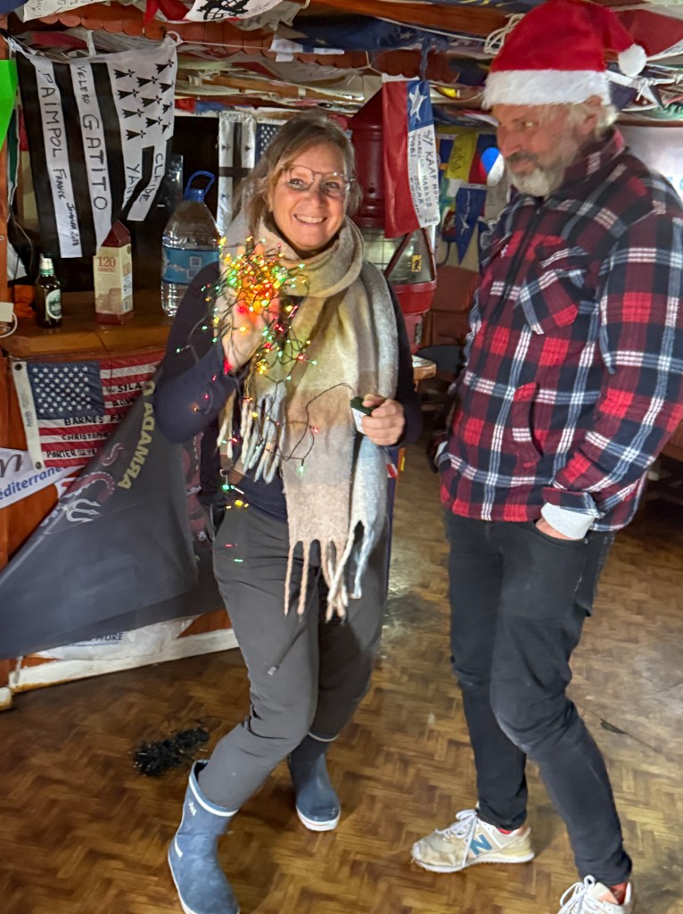 Well, it looks like it is Christmas Eve, and all the cruisers and hangers on turn the club into a party. It was so nice to get everyone in a festive mood and talking. What fascinated me most is that everyone there had a wild story to tell. I am cooking the side of salmon. My California-based barbeque skills came in handy.