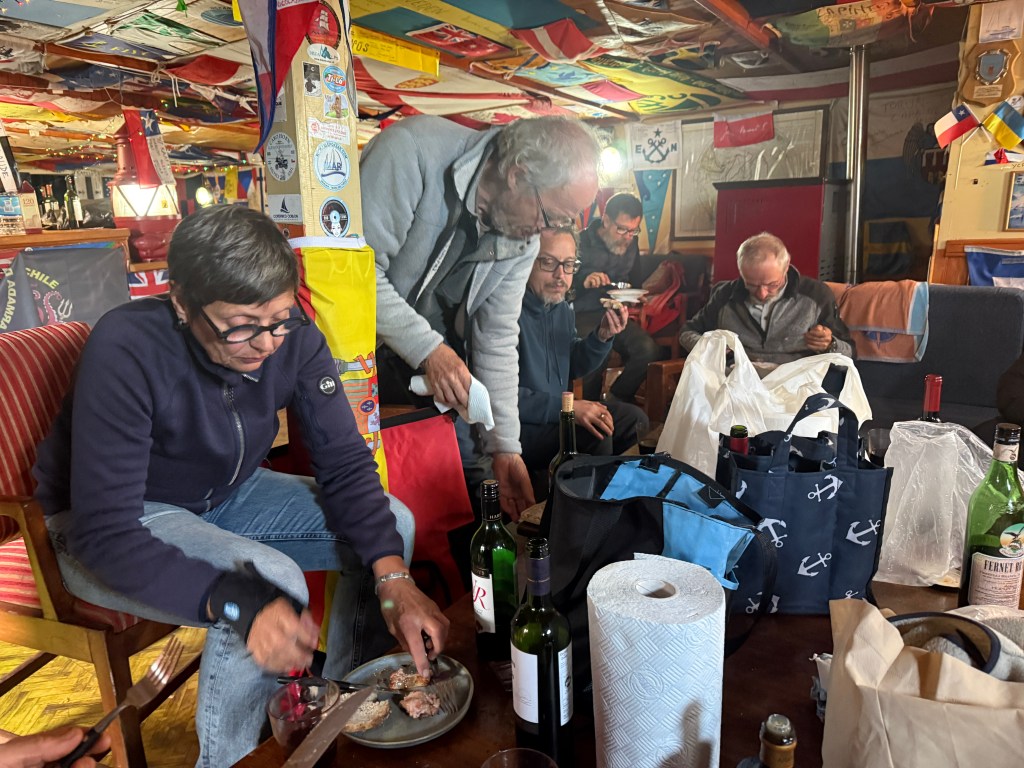 We are enjoying a fabulous lunch of lamb cooked by chef Nicki (there are vegi’s on board so I did not go hungry). I especially appreciated the mint sauce made by Magnus’s wife Julie who collected the wild mint earlier that morning.
