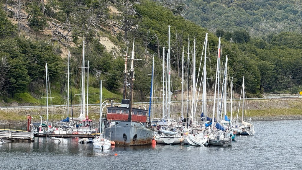 There is a small “downtown” with a couple of restaurants and food stores but not much else In Puerto Williams – and certainly nothing outside of the “club” except this photo-op. But Randall and I are happy to be here. Cruisers come here because many find it easier to launch to the Antarctic from Chile rather than Argentina.