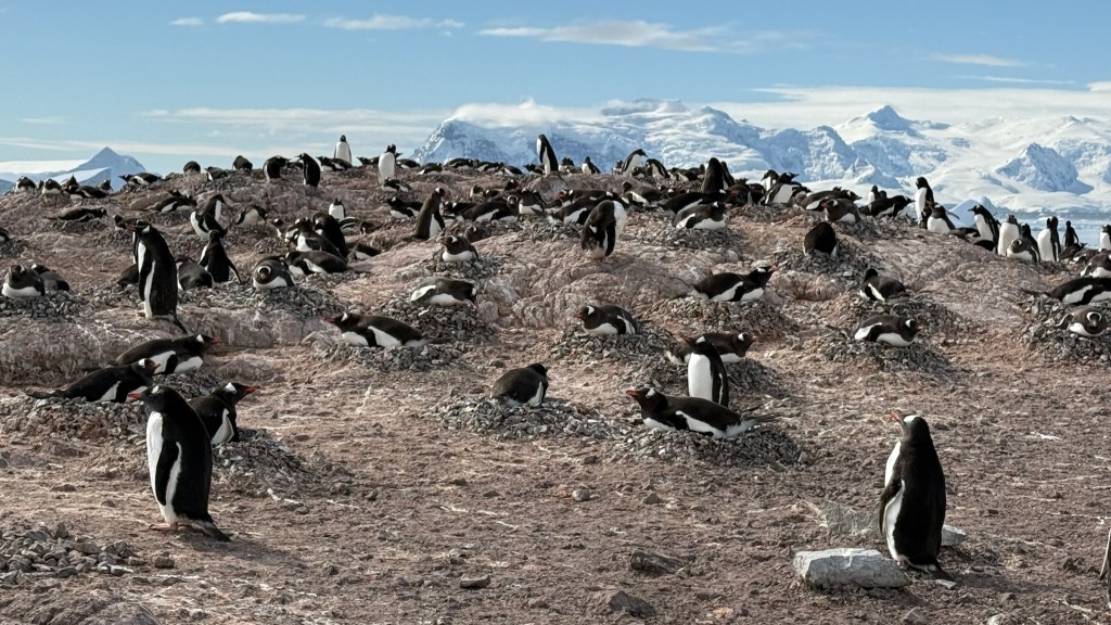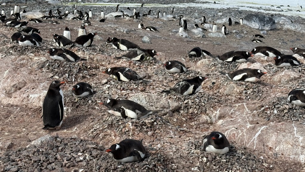 Above: It’s hard to tell the boys from the girls, but you can see a couple of penguins in their off time. No need for them, at the moment, to be in the nest to hold the eggs. They just walk around looking to grab a rock or two for their nest which seems to upset the other penguins.