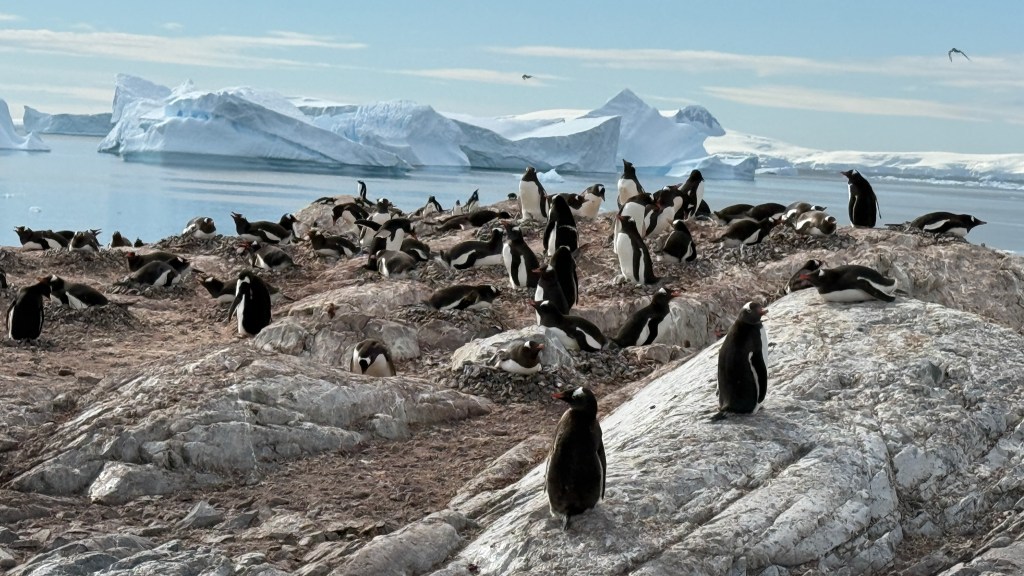 Above: This video starts off with a jaunting gentoo, and finishes with a shot of a parent feeding one of the few hatchlings in the rookery.
